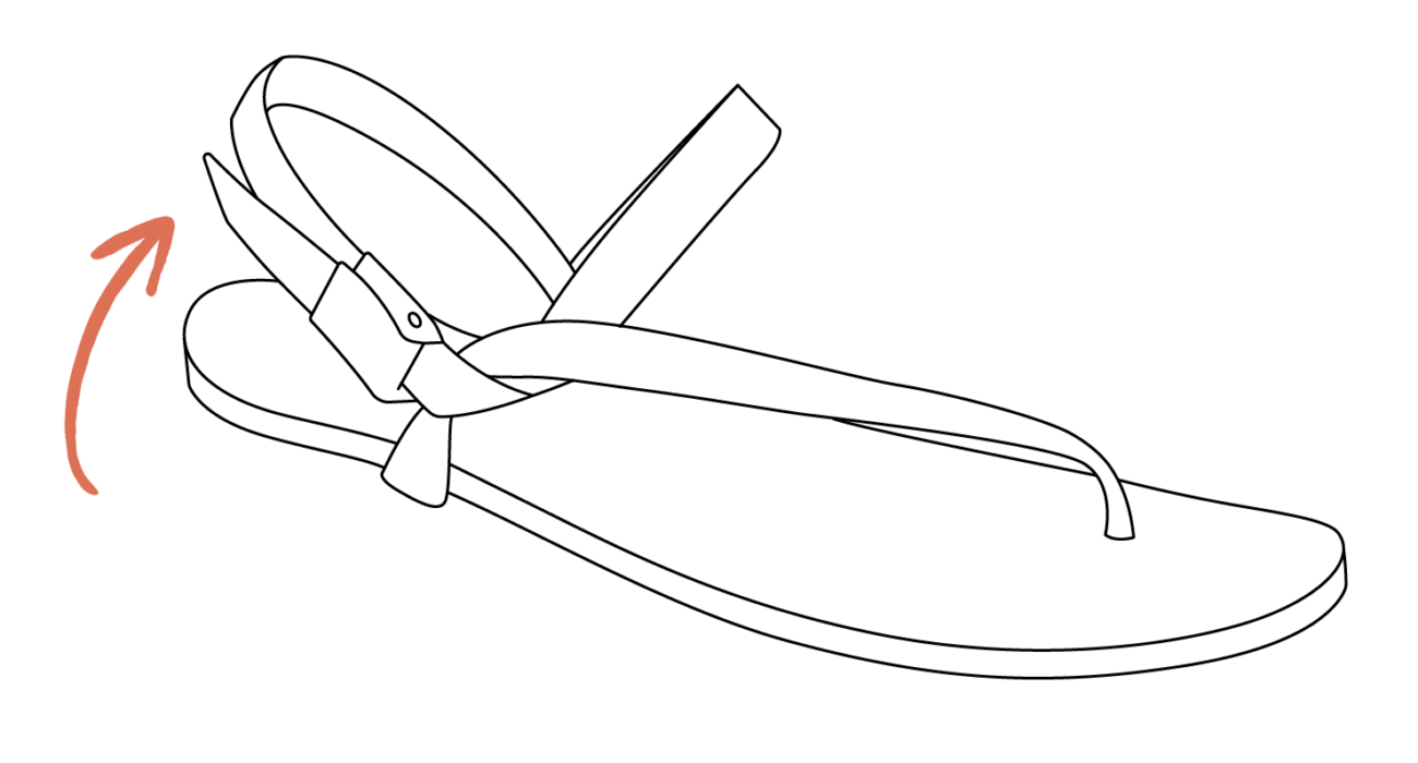 6. התאמת רצועת העקב - בשלב זה מומלץ לנעול את הסנדל על כף הרגל בכדי לדייק את מידת מתיחת הרצועה באופן הרצוי. יש לשים לב שהרצועה לא מקופלת או מסובבת סביב עצמה באיזור העקב. לאחר המתיחה על כף הרגל נשחיל את הרצועה לתוך הלולאה הפנימית מבפנים החוצה.